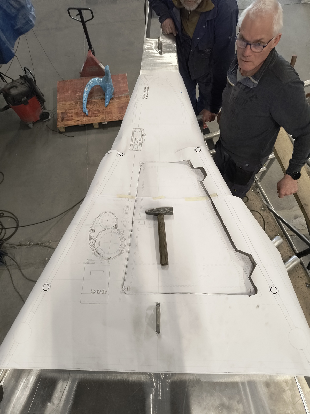 Hatches and deck equipment are fitted in close consultation with the owner who lives far away. A 1:1 print is used here to locate the exact hatch opening as on the last drawing.